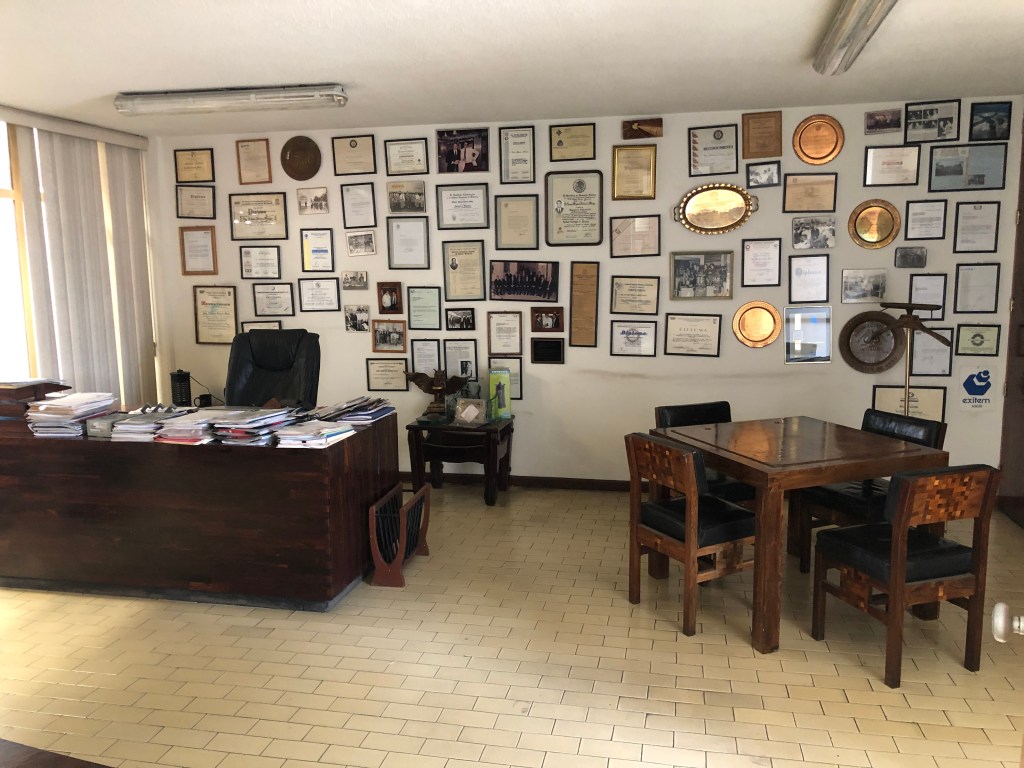 El libro que tengo aquí en mis manos surgió a partir de varias visitas a su oficina en EISSA, en la que conservaba una pared llena de marcos que daban cuenta de su trayectoria profesional. Entre títulos, diplomas, reconocimientos, invitaciones y cartas de agradecimiento, conservaba algunas fotografías de momentos importantes de su vida que me llamaron mucho la atención. Con el cese de operaciones de la empresa, vino el abandono del que fuera su espacio de trabajo durante más de treinta años y teníamos que hacer algo para conservar todos estos valiosos recuerdos.